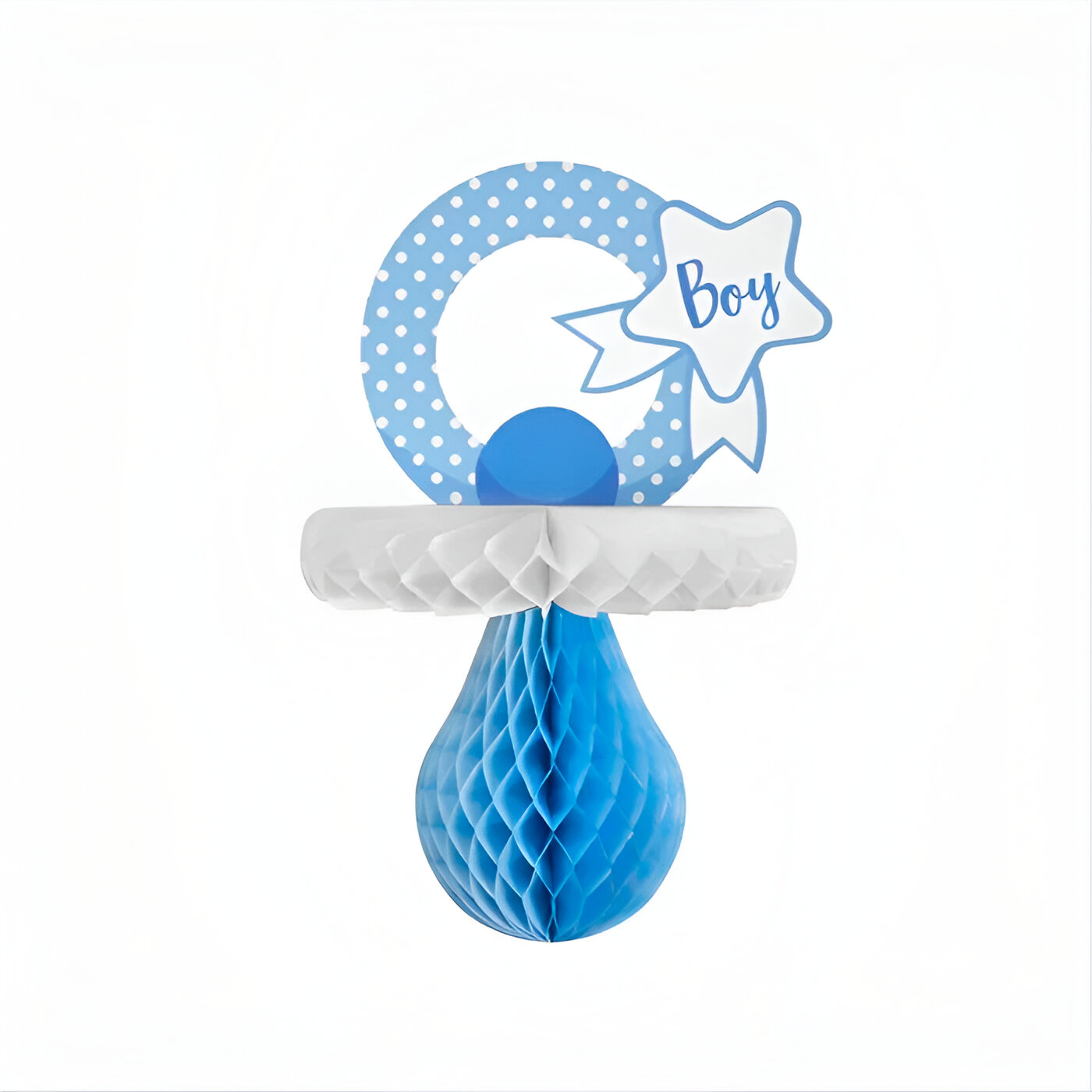 Μια εντυπωσιακή μπλε διακοσμητική κυψέλη με σχέδιο πιπίλα και μήνυμα “boy”, για να να στολίσεις μοναδικά το χώρο του πάρτι, τη βάπτιση, ή να καλωσορίσεις το γλυκό αγοράκι σπίτι από το μαιευτήριο.