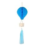 Μια εντυπωσιακή μπλε διακοσμητική κυψέλη με σχέδιο Αερόστατο και ουρά-φούντα, για να κρεμάσετε από την οροφή και να στολίσετε το χώρο σας για το πάρτι, τη βάπτιση, τη γέννηση ή τη διακόσμηση παιδικού δωματίου.