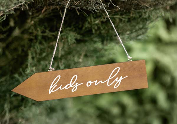 - Η ταμπέλα είναι ξύλινη και γράφει επάνω “”Kids only””